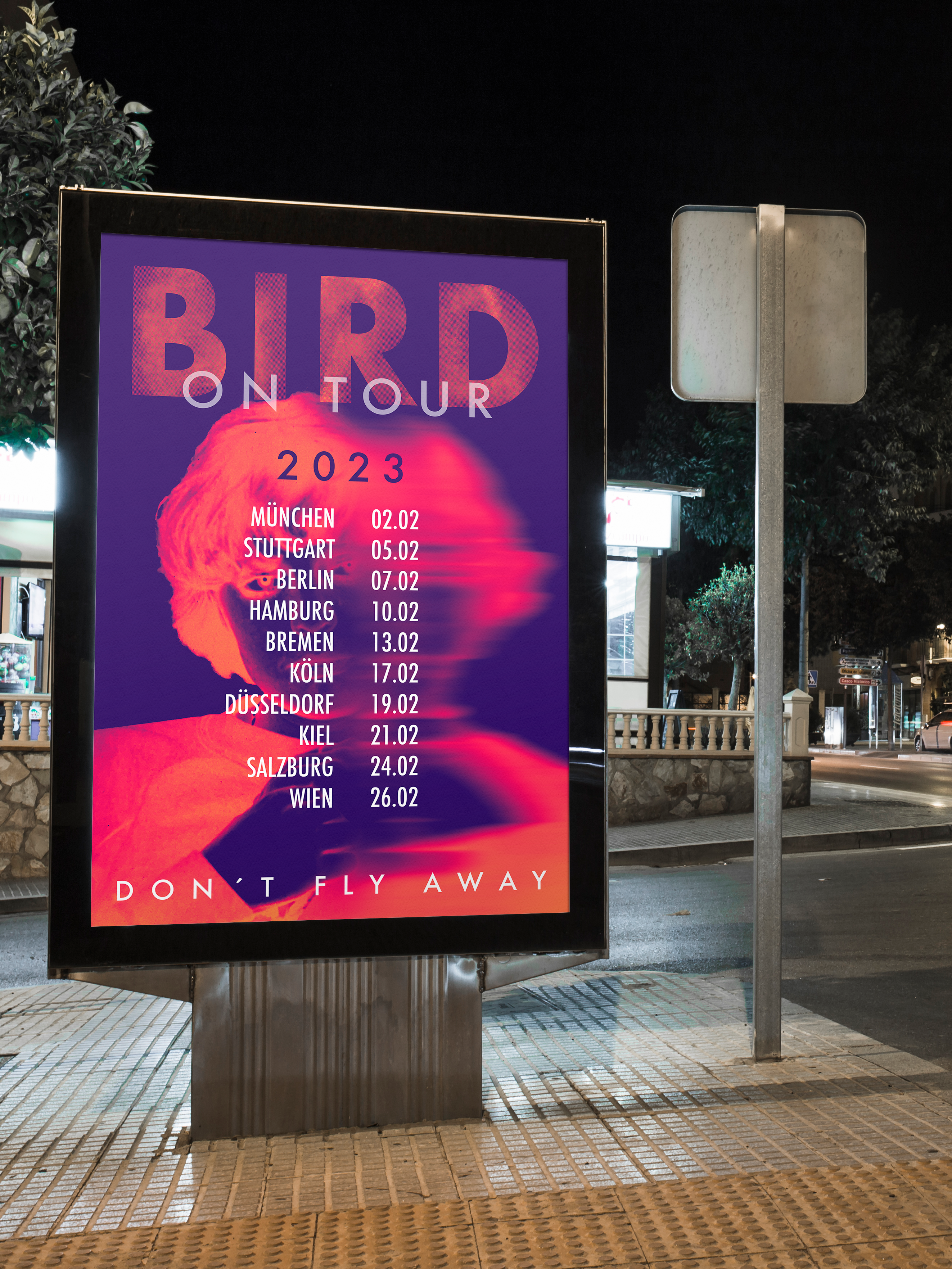 Für die fiktive Künstlerin BIRD entstand eine illustrative Gestaltung, die ihre imaginäre Klangwelt visuell einfängt. Das Projekt umfasst ein Plattencover, Buttons und ein Tourplakat – alle verbunden durch eine eigenständige, expressive Bildsprache. Farben, Formen und Illustrationen schaffen eine Atmosphäre, die zugleich leicht, geheimnisvoll und markant wirkt und der Künstlerin ein unverwechselbares visuelles Profil verleiht.